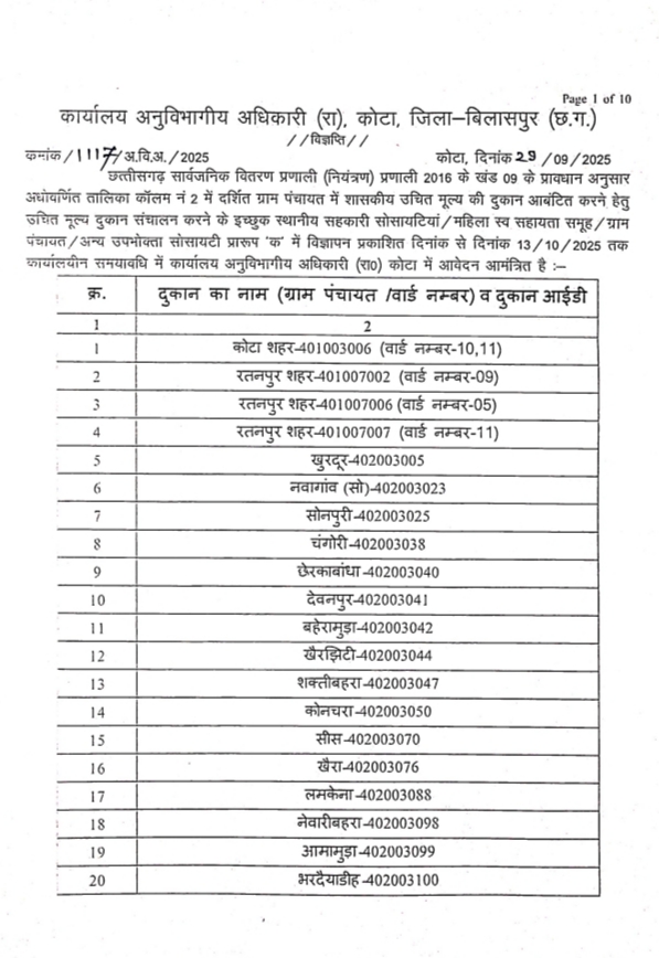 बिलासपुर —कोटा विकासखंड के ग्राम पंचायत खुरदुर, सोनसांय नवागांव, सोनपुरी, चंगोरी, दवनपुर, छेरकाबांधा, बहेरामुड़ा, खैरझिटी, शक्तिबहरा, कोंचरा, सीस, खैरा, लमकेना, नेवारीबहरा, आमामुड़ा, भरदैयाडीह, और नगर पंचायत रतनपुर के वार्ड नंबर 11, वार्ड नंबर 9, वार्ड नंबर 5, नगर पंचायत कोटा के वार्ड नंबर 10 व 11 के शासकीय उचित मूल्य दुकान संचालन के लिए 13 अक्टूबर तक एसडीएम कार्यालय में आवेदन आमंत्रित किया गया है। इच्छुक प्राथमिक कृषि साख समिति, वन सुरक्षा समिति, महिला स्वसहायता समूह, अन्य उपभोक्ता सहकारी समिति आवश्यक दस्तावेज समूह का पंजीयन प्रमाण पत्र, सहित आवेदन प्रस्तुत कर सकते हैं।