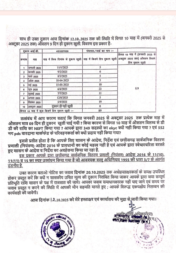 नोटिस में चेतावनी दी गई है कि निर्धारित अवधि में संतोषजनक जवाब प्राप्त न होने पर छत्तीसगढ़ लोक वित्तीय नियम 2016 की धारा 111(1) एवं सार्वजनिक वितरण प्रणाली (नियंत्रण) आदेश 1955 की धारा 37(7) के तहत आवश्यक कार्रवाई की जाएगी।