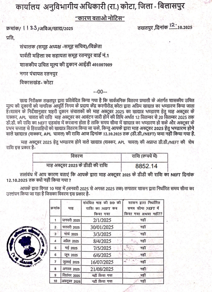 बिलासपुर —– नगर पंचायत रतनपुर अंतर्गत संचालित पार्वती महिला स्व. सहायता समूह वार्ड नंबर 1 राशन सामग्री के लिए समय पर डी डी जमा नही करने और राशन वितरण में लापरवाही बरतने पर कोटा के अनुविभागीय अधिकारी (रा.) कार्यालय द्वारा कारण बताओ नोटिस जारी किया गया है। जारी नोटिस के अनुसार समूह को जनवरी 2025 से लेकर अक्टूबर 2025 तक की अवधि में शासन द्वारा नियत समयावधि में डी डी जमा नहीं किया गया। इसके चलते लाभार्थियों को भुगतान में विलंब हुआ और शासन की योजनाओं के संचालन पर प्रतिकूल प्रभाव पड़ा।