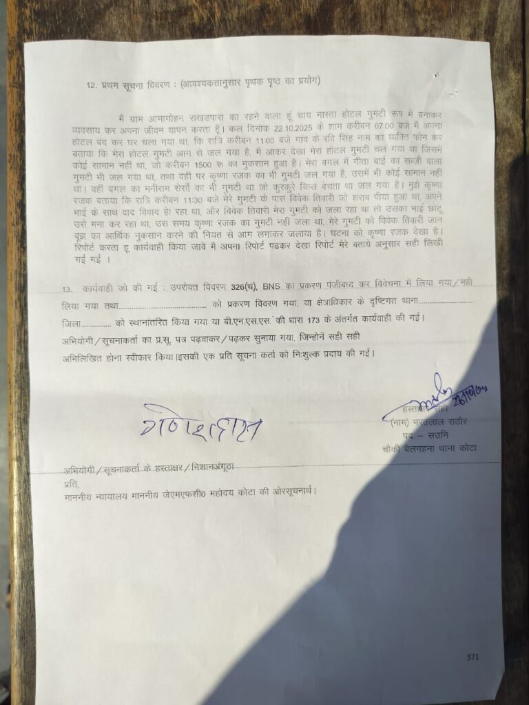 पूरा मामला है बिलासपुर जिले के बेलगहना चौकी अंतर्गत ग्राम अमागोहन खोगसरा का बीती रात लगभग 11बजे होटल गुमटी व पान दूकान मे आग लगा दिया गया जिससे तीनो दुकान मे लगी पन्नी जलकर ख़ाक हो गया अस्थाई होटल होने के कारण ज्यादा नुकसान नहीं हुआ पिछले कई बार भी होटल गुमटी को जलाया जा चूका है मिली जानकारी के अनुसार विवेक तिवारी ने जान बुझ कर आर्थिक नुकसान करने के नियत से आग लगाया गणेश दास,गीता मनीराम, कृष्णा रजक, द्वारा बेलगहना चौकी मे रिपोर्ट दर्ज कराया गया |