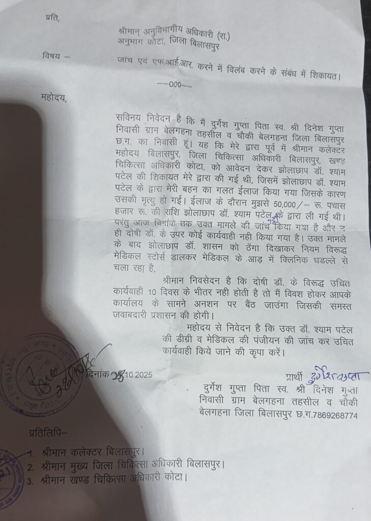 बिलासपुर— कोटा विकासखंड के अंतर्गत ग्राम बेलगहना में झोलाछाप डॉक्टर के गलत इलाज से एक युवती की मौत का मामला सामने आया है। मृतका के परिजनों ने डॉक्टर के खिलाफ सख्त कार्रवाई और एफआईआर दर्ज करने की मांग की है। ग्राम बेलगहना निवासी दुर्गेश गुप्ता, पिता स्व. दिनेश गुप्ता ने कोटा अनुविभागीय अधिकारी (राजस्व) को आवेदन देकर बताया कि उनकी बहन की तबीयत खराब होने पर स्थानीय डॉ. श्याम पटेल के पास इलाज के लिए ले जाया गया था। डॉक्टर ने बिना उचित जांच के दवाइयाँ दीं और इलाज के नाम पर लगभग 50 हजार रूपए की राशि ले ली।