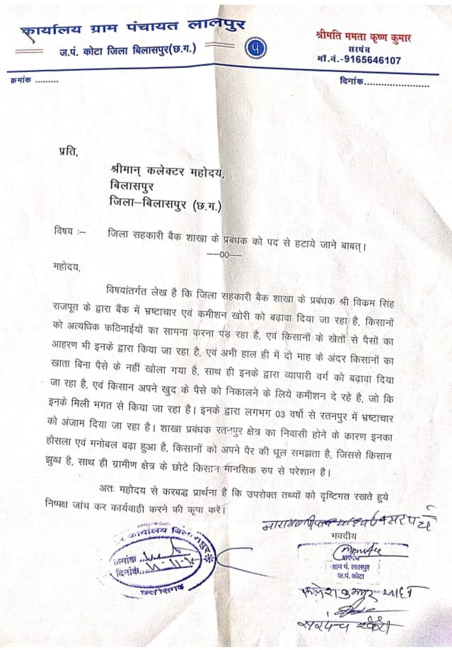 बिलासपुर — जनपद पंचायत कोटा के अंतर्गत ग्राम पंचायत लालपुर से जिला कलेक्टर बिलासपुर को एक लिखित आवेदन भेजकर जिला सहकारी बैंक शाखा के प्रबंधक पर गंभीर आरोप लगाए गए हैं।