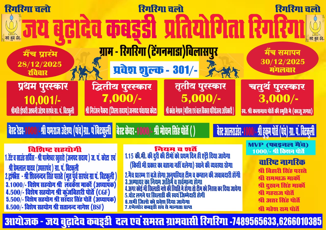 जय बुढ़ादेव कबड्डी प्रतियोगिता रिगरिगा मैंच का प्रारम्भ 28/12/2025 एवं समापन 30/12/2025 तक होगी l