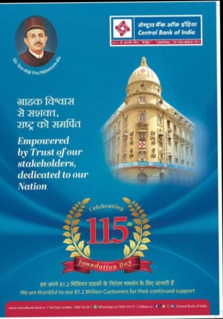 बिलासपुर— देश के अग्रणी सार्वजनिक क्षेत्र के बैंक सेंट्रल बैंक ऑफ़ इंडिया का 115 वां स्थापना दिवस करगी रोड कोटा शाखा में बड़े ही हर्ष और उल्लास के साथ मनाया गया। इस अवसर पर शाखा परिसर को सजाया गया और बैंक की गौरवशाली परंपरा व सेवा भावना को याद किया गया।