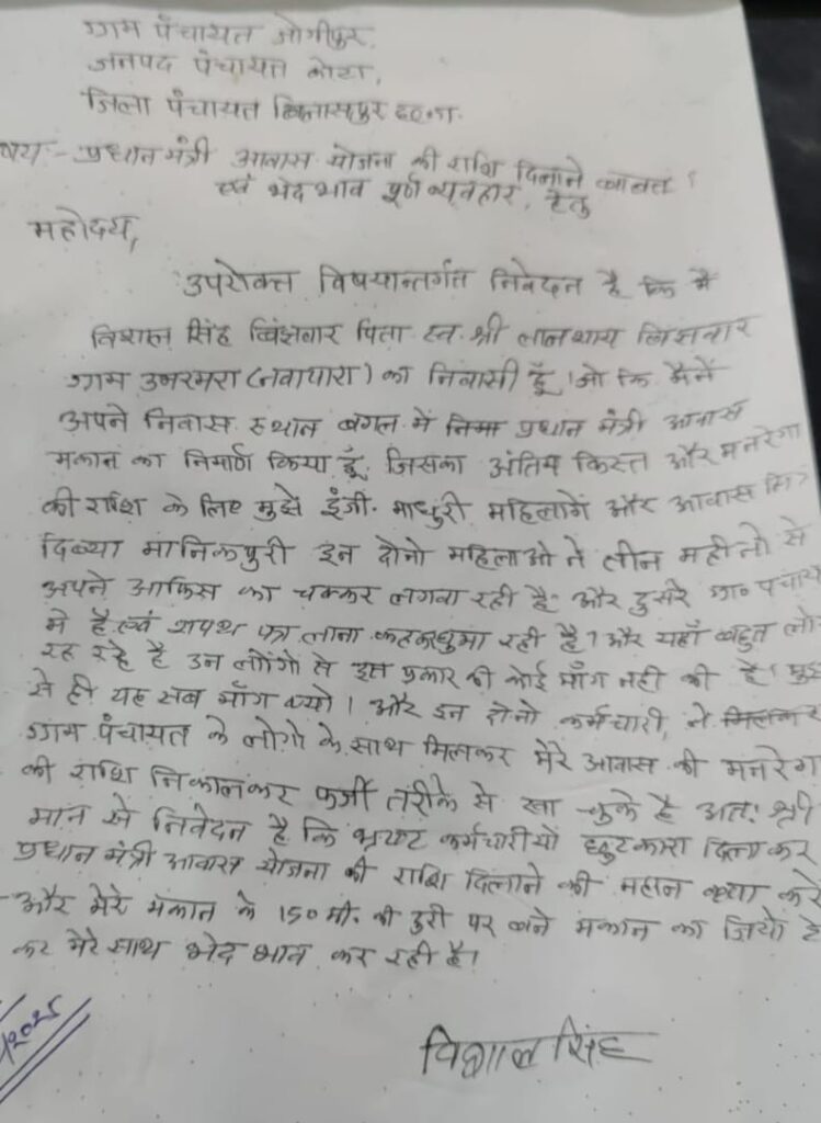 बिलासपुर — जनपद पंचायत कोटा अंतर्गत ग्राम पंचायत जोगीपुर में प्रधानमंत्री आवास योजना में गंभीर गड़बड़ी का मामला सामने आया है। ग्राम उमरमरा ( नवापारा) निवासी विशाल सिंह बिंझवार पिता स्व. लालसाय बिंझवार ने ग्राम पंचायत एवं जनपद पंचायत के अधिकारियों पर योजना की राशि दिलाने के नाम पर अवैध वसूली और फर्जीवाड़े का आरोप लगाया है।