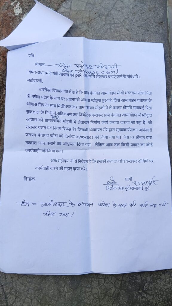 शिकायतकर्ता के अनुसार ग्राम पंचायत आमागोहन में भरतराम पटेल पिता गणेश पटेल के नाम प्रधानमंत्री आवास स्वीकृत हुआ था, लेकिन उक्त आवास को आवास मित्र की मिलीभगत से ग्राम पंचायत मोहली ले जाकर रामबाई के निजी भूमि पर जिओ टैग कर निर्माण कराया जा रहा है। यह प्रक्रिया शासन के नियमों के पूर्णतः विपरीत बताई जा रही है।