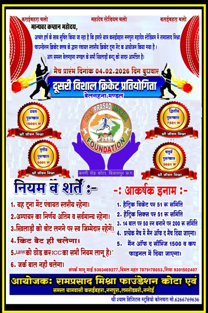 बिलासपुर — रामप्रसाद मिश्रा फाउंडेशन के तत्वावधान में आयोजित दूसरी विशाल पंचायत स्तरीय क्रिकेट प्रतियोगिता का शुभारंभ उत्साहपूर्ण मुकाबलों के साथ हुआ। प्रतियोगिता के पहले दिन दो रोमांचक मैच खेले गए, जिसमें खिलाड़ियों ने शानदार प्रदर्शन कर दर्शकों का भरपूर मनोरंजन किया।