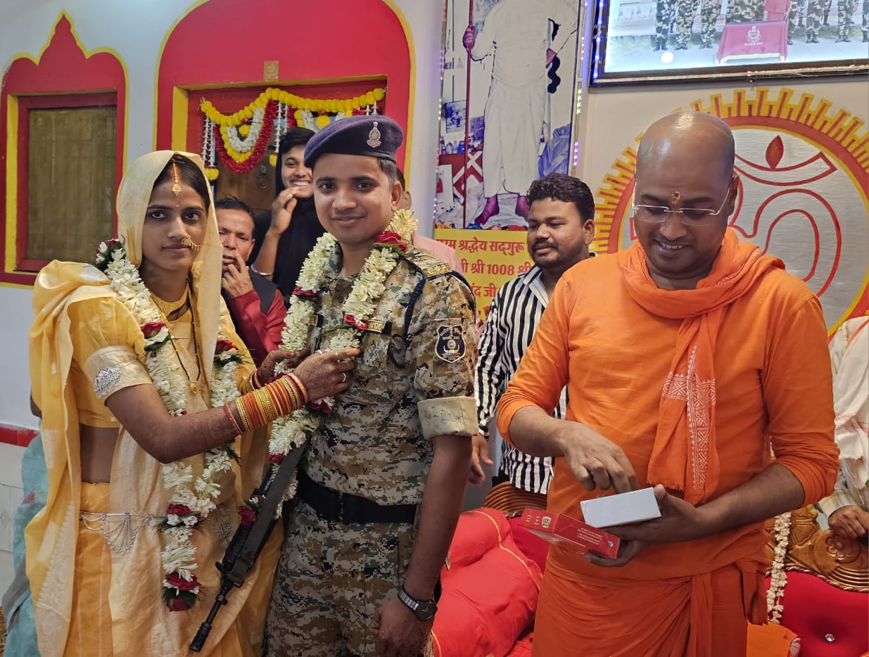 सुरक्षा में तैनात जवान ने आश्रम में रचाई शादी। पूज्य श्री श्री 108 श्री स्वामी शिवानंद महाराज जी के सुरक्षा में तैनात जवान सत्यप्रकाश पटेल ने लोकसभा में लगा आचार संहिता का निर्वहन करते हुए एवं ड्यूटी मे रह कर, स्वामी जी की परमसानिध्य मे श्री सिद्ध बाबा व स्वामी जी के समक्ष एक दूसरे को जयमाला पहनाकर नव दाम्पत्य जीवन में प्रवेश किये,एवं श्री सिद्ध बाबा व पूज्य श्री से आशीर्वाद प्राप्त किये। शादी की तिथि पूर्व में निर्धारित होने के कारण एवं आचार संहिता को ध्यान में रख कर वर वधु एवं उनके माता पिता ने आश्रम में ही जयमाला विवाह करने का निर्णय लिए।इस मांगलिक कार्य में वर वधु के माता पिता रिश्तेदार एवं आश्रम परिवार के सभी सदस्य उपस्थित होकर वर वध को सुखमय जीवन का आशीर्वाद दिये।आश्रम परिवार ने उनके इस कार्य को सराहनीय बताते हुए, उनके जीवन की मंगलमय कामना किये।
