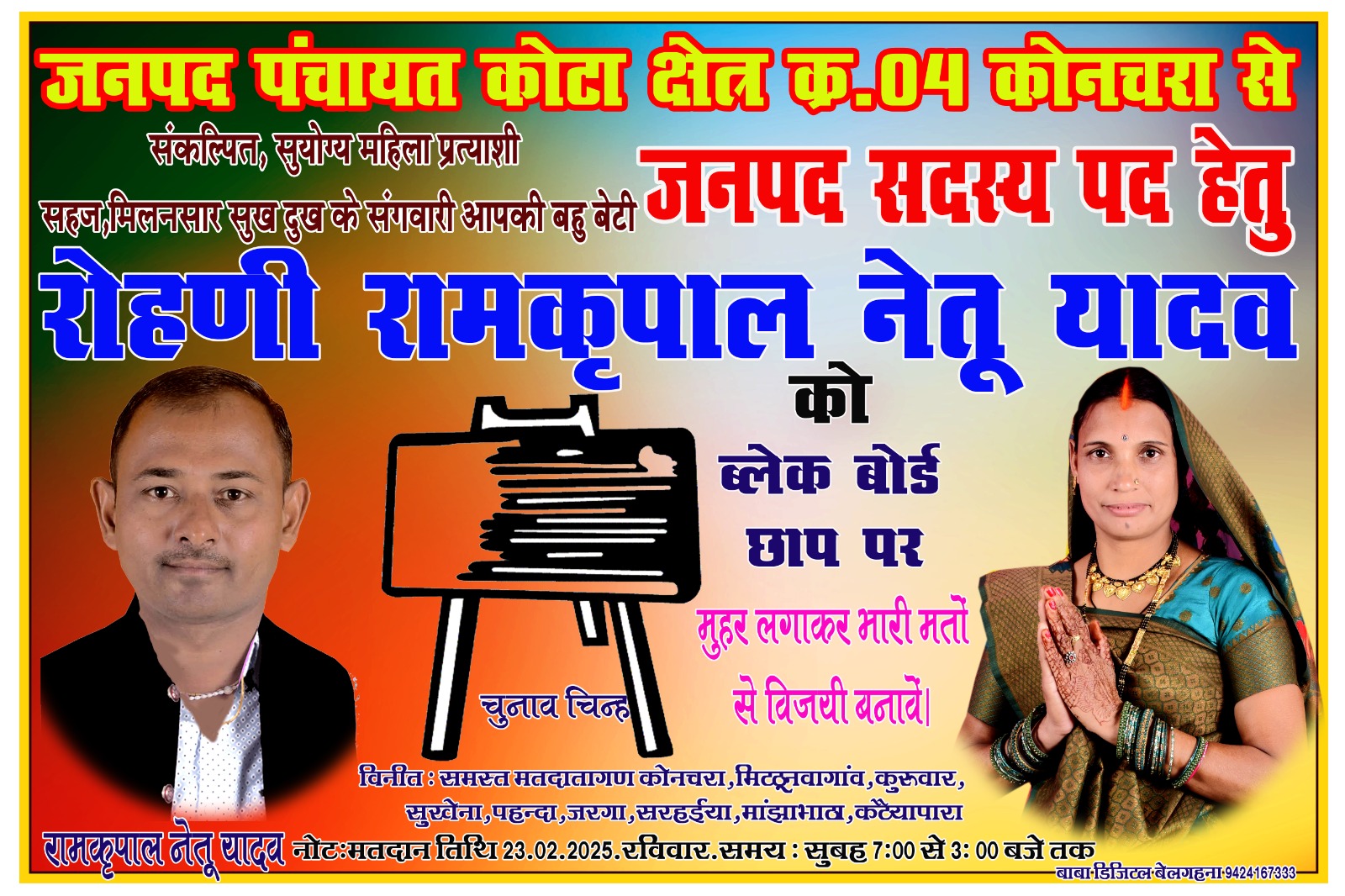 बिलासपुर — कोटा विकासखंड में 23 फरवरी को त्रिस्तरीय पंचायत चुनाव का समापन हुआ कोटा विकासखंड के अंतर्गत जनपद पंचायत क्षेत्र क्रमांक 4 आरक्षण प्रक्रिया में सामान्य महिला सीट होने के चलते हाईप्रोफाइल हो गई थी, ग्राम पंचायत कोनचरा के आश्रित ग्राम जरगा के रहने वाली रोहणी नेतू यादव यहां से चुनाव लड़ी, इस चुनाव में रोहणी नेतू यादव सिंह ने दिन-रात मेहनत कर क्षेत्र की जनता का विश्वास जीतने में कामयाब रही और भाजपा समर्पित प्रत्याशी के साथ साथ कांग्रेस नेता की पत्नी को 105 वोट से पराजित कर चुनाव में जीत दर्ज की l जनपद क्षेत्र में चुनाव के परिणाम को लेकर देर रात तक बूथ कार्यकर्ताओं सहित क्षेत्र के ग्रामीण डटे रहे जैसे ही परिणाम रोहणी नेतू यादव के पक्ष में आना शुरू हुआ यहाँ बधाई देने वालों का तांता लगा रहा। ज्ञात हो कि रोहणी यादव के पति नेतू यादव यादव समाज में प्रवक्ता हैं साथ ही आसपास ग्राम के ग्रामीणों के सुख दुख में हमेशा साथ खड़े रहते हैं l रोहणी नेतू यादव ने जनपद पंचायत की जीत को क्षेत्र की जनता की जीत बताई l