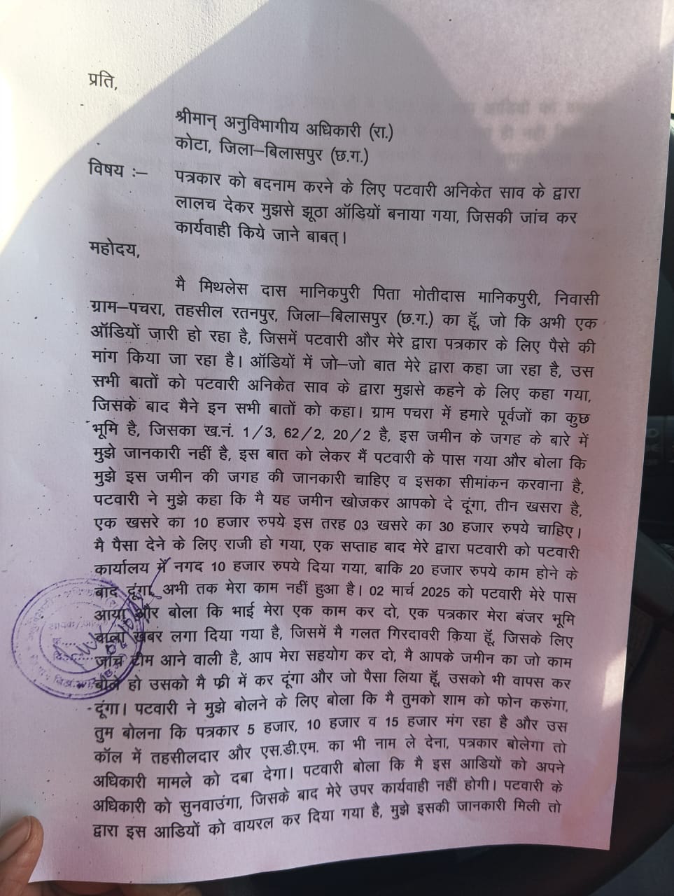 बिलासपुर — रतनपुर तहसील के अंतर्गत ग्राम पचरा में पदस्थरिश्वतखोर पटवारी अनिकेत साव को कल उनके पैसे लेते वीडियो वायरल होने के कारण निलंबित कर दिया गया था, साथ ही पटवारी और एक व्यक्ति को जिसको पचरा का उपसरपंच बताया जा रहा था, ऑडियो वायरल हुआ था जिसमें पटवारी से पैसे देकर मामले को दबाने की बात कह रहा था, इस ऑडियो मामले में आज अनुविभागीय अधिकारी कोटा के पास एक आवेदन दिया गया है जिसमें पटवारी के द्वारा लालच देकर उस ऑडियो को बनवाया गया था आवेदनकर्ता ने आवेदन में बताया है कि मै मिथलेस दास मानिकपुरी पिता मोतीदास मानिकपुरी, निवासी ग्राम-पचरा, तहसील रतनपुर, जिला-बिलासपुर (छ.ग.) का हूँ , जो कि अभी एक ऑडियों जारी हो रहा है, जिसमें पटवारी और मेरे द्वारा पत्रकार के लिए पैसे की मांग किया जा रहा है। ऑडियों में जो-जो बात मेरे द्वारा कहा जा रहा है, उस सभी बातों को पटवारी अनिकेत साव के द्वारा मुझसे कहने के लिए कहा गया, जिसके बाद मैने इन सभी बातों को पटवारी अनिकेत साव से कहा, ग्राम पचरा में हमारे पूर्वजों का कुछ भूमि है, जिसका ख.नं. 1/3, 62/2 व 20/2 है, इस जमीन के जगह के बारे में मुझे जानकारी नहीं है, इस बात को लेकर मैं पटवारी के पास गया और बोला कि मुझे इस जमीन की जगह की जानकारी चाहिए व इसका सीमांकन करवाना है, पटवारी ने मुझे कहा कि मै यह जमीन खोजकर आपको दे दूंगा, तीन खसरा है, एक खसरे का 10 हजार रुपये इस तरह 03 खसरे का 30 हजार रुपये चाहिए। मै पैसा देने के लिए राजी हो गया, एक सप्ताह बाद मेरे द्वारा पटवारी को पटवारी कार्यालय में नगद 10 हजार रुपये दिया गया, बाकि 20 हजार रुपये काम होने के बाद दूंगा अभी तक मेरा काम नहीं हुआ है। 02 मार्च 2025 को पटवारी मेरे पास आया और बोला कि भाई मेरा एक काम कर दो, एक पत्रकार मेरा बंजर भूमि वाला खबर लगा दिया गया है, जिसमें मै गलत गिरदावरी किया हूँ, जिसके लिए जांच टीम आने वाली है, आप मेरा सहयोग कर दो, मै आपके जमीन का जो काम है उसको मै फ्री में कर दूंगा और जो पैसा लिया हूँ, उसको भी वापस कर दूंगा। पटवारी ने मुझे बोलने के लिए बोला कि मै तुमको शाम को फोन करूंगा. तुम बोलना कि पत्रकार 5 हजार, 10 हजार व 15 हजार मांग रहा है और उस कॉल में तहसीलदार और एस.डी.एम. का भी नाम ले देना ऑडियो में बोलना कि पत्रकार बोलेगा तो अधिकारी मामले को दबा देगा। पटवारी बोला कि मै इस आडियों को अपने अधिकारी को सुनवाउंगा, जिसके बाद मेरे ऊपर कार्यवाही नहीं होगी। पटवारी के द्वारा इस आडियों को वायरल कर दिया गया है, मुझे इसकी जानकारी मिली तो 03 मार्च 2025 को पटवारी मुझे मिला तो मै बोला सर आप आडियों को वायरल कर दिये हो इसमें मै फस जाउंगा, मै तो पत्रकार से कोई बात ही नहीं किया हूँ, आपके बोलने पर सभी बात को बोला हूँ। पटवारी बोला कि आपके ऊपर कुछ नहीं होगा। 04 मार्च 2025 को पटवारी पुनः म