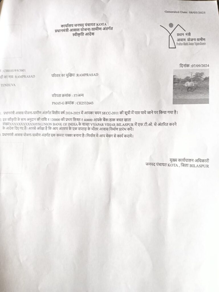 बिलासपुर — छत्तीसगढ़ में प्रधानमंत्री आवास योजना का जमकर प्रचार किया जा रहा हैं, भाजपा कार्यकर्त्ताओं के द्वारा प्रधानमंत्री आवास योजना का प्रचार गांव गांव में जोर शोर से किया जा रहा हैं l इधर कोटा ब्लॉक में आवास योजना में बड़ा फर्जीवाड़ा सामने आया हैं l प्रधानमंत्री आवास योजना में आवास मकान के लिए स्वीकृत हितग्राही की मौत हो चुकी है, रोजगार सहायक के द्वारा इस नाम के दूसरे व्यक्ति का जिओ टेक कर दिया गया साथ ही इस नाम के तीसरे व्यक्ति के में आवास की राशि चली गई हैं जिसके नाम से आवास स्वीकृत हुआ था उसके बेटे के द्वारा सुशासन तिहार में आवेदन देकर शिकायत दर्ज कराया है l जिसमें मुख्य कार्यपालन अधिकार जनपद पंचायत कोटा के द्वारा मामले में जांच टीम गठित किया गया हैं l