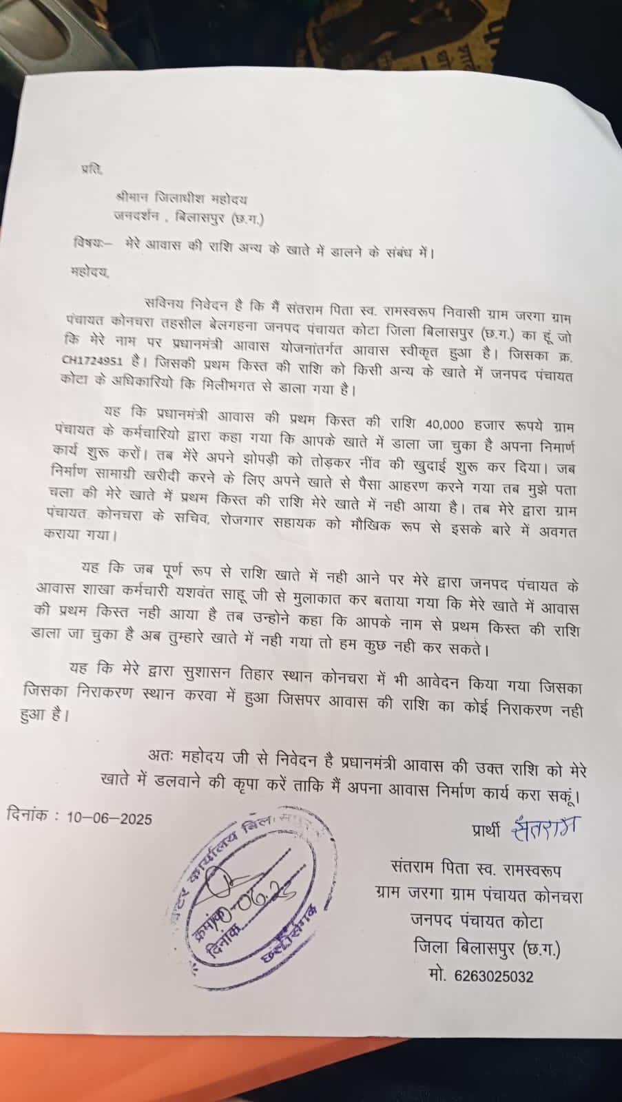 कोटा ब्लॉक के अंतर्गत ग्राम पंचायत कोनचरा के आश्रित ग्राम जरगा के रहने वाले संतराम ने कलेक्टर में आवेदन देकर शिकायत किया हैं, शिकायत में बताया हैं कि मेरे नाम से प्रधानमंत्री आवास योजना के तहत आवास स्वीकृत हुआ हैं जिसका आईडी क्रमांक सीएच 1724951 हैं, मेरे आवास के प्रथम किश्त की राशि को जनपद के अधिकारियों के द्वारा मिलीभगत कर दूसरे के खाते में डाल दिया गया हैं l ग्राम पंचायत के कर्मचारियों के द्वारा कहा गया कि प्रधानमंत्री आवास की प्रथम किश्त की राशि 40 हजार आपके खाते में डाल दी गई हैं आप अपना आवास का निर्माण कार्य शुरू करो मैं अपना झोपड़ी को तोड़कर नींव खोदाई शुरू कर दिया l ज़ब निर्माण सामग्री खरीदी करने के लिए अपने खाता से राशि आहरण करने गया तब मुझे पता चला कि प्रधानमंत्री आवास योजना कि प्रथम किश्त मेरे खाते में नही आई हैं तब मेरे द्वारा ग्राम पंचायत के सचिव और रोजगार सहायक को मौखक रूप से इसके बारे से अवगत कराया गया l ज़ब राशि पूर्ण रूप से खाते में नही आया तब जनपद पंचायत कोटा के आवास शाखा के कर्मचारी यशवंत साहू से मुलाक़ात करके उनको बताया कि मेरे खाता में प्रधानमंत्री आवास योजना का प्रथम किश्त नही आया हैं तब उन्होंने कहा कि आपके नाम से आवास का प्रथम किश्त कि राशि डाला जा चुका हैं अब तुम्हारे खाते में नही गया तो हम कुछ नही कर सकते हैं l इसलिए संतराम ने कलेक्टर को आवेदन देकर प्रथम किश्त कि राशि दिलाने के लिए गुहार लगाया हैं l