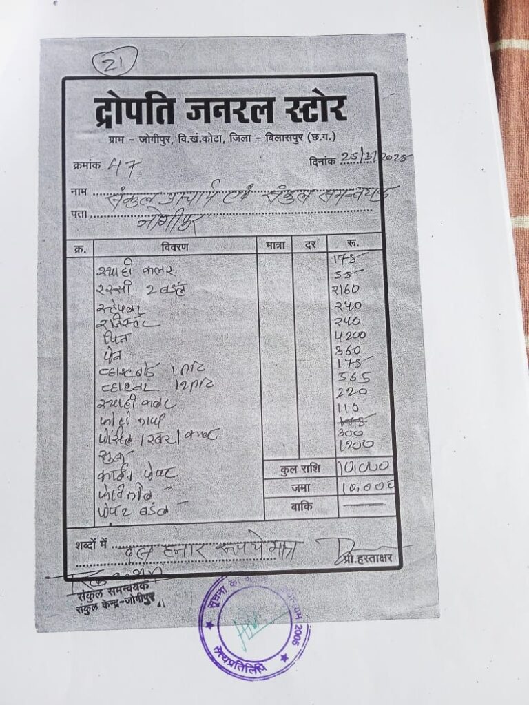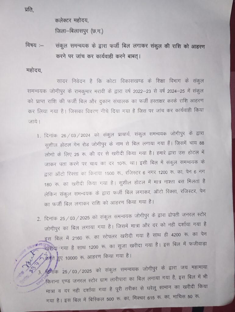 बिलासपुर —- कोटा विकासखंड के संकुल केंद्र जोगीपुर के संकुल समन्वयक के द्वारा संकुल को मिलने वाली राशि का फर्जी बिल लगाकर और दुकान संचालक का फर्जी हस्ताक्षर करके राशि का आहरण कर लिए गया हैं, इसकी शिकायत कलेक्टर से करके जांच कर कार्रवाई की मांग की हैं l