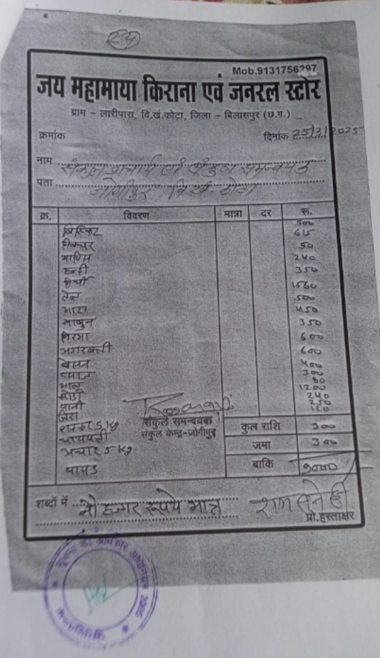 इस बिल में 2160 रुपए का स्टेपलर खरीदी गया है साथ ही 4200 रुपए का पेन खरीदा गया है, 1200 रुपए का सुजा खरीदा किया गया है। इस बिल में फर्जीवाड़ा करते हुए समन्वयक के द्वारा 10 हजार रुपए का आहरण किया गया है। 25 मार्च को ही संकुल समन्वयक जोगीपुर के द्वारा जय महामाया किराना एण्ड जनरल स्टोर ग्राम लारीपारा का बिल लगाया गया है, इस बिल में मात्रा व दर नही दर्शाया गया है, पूरी तरह से घरेलू सामान की खरीदी किया गया है। इस बिल में बिस्किट 500 रुपए, मिक्चर 615 रुपए, माचिस 50 रुपए,हल्दी 240 रुपए , मिर्ची 350 रुपए, तेल 1560 रुपए, आटा 500 रुपए , साबुन 450 रुपए, निरमा 350 रुपए अगरबत्ती 600 रुपए, बेसन 600 रुपए, प्याज 400 रुपए, आलू 300 रुपए, सोडा 80 रुपए, पानी 1200 रुपए, जीरा 240 रुपए, शक्कर 250 रुपए, चायपत्ती 120 रुपए का इस तरह से 9 हजार रुपए का फर्जी बिल लगाया गया। संकुल समन्वयक को संकुल में ही इस राशि को खर्च करना था लेकिन घेरलू सामानों में इस राशि का उपयोग किया गया। संकुल समन्वयक के द्वारा और भी बिलों में दुकान के संचालक का फर्जी हस्ताक्षर करके राशि का आहरण किया गया है। साथ ही संकुल समन्वयक के द्वारा और भी फर्जी बिल लगाकर राशि का आहरण किया गया हैं इन सब शिकायत पर जांच कराकर कार्रवाई करने की मांग किया गया हैं l