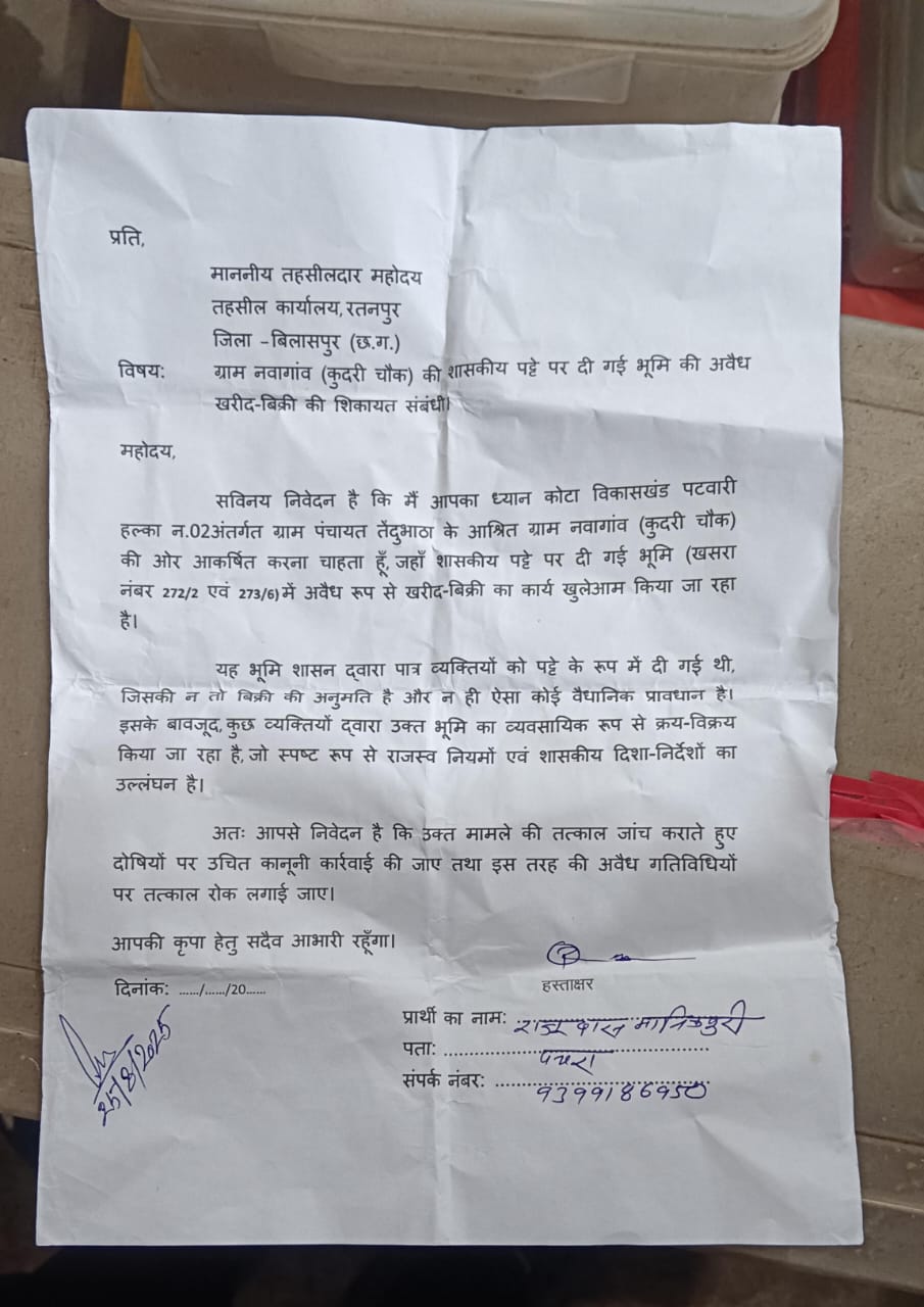 बिलासपुर — बेलगहना तहसील इन दिनों लगातार विवादों और शिकायतों के घेरे में है। तहसील में पदस्थ तहसीलदार अभिषेक राठौर के खिलाफ भ्रष्टाचार, कार्य में लापरवाही और जनप्रतिनिधियों व ग्रामीणों से दुर्व्यवहार जैसे गंभीर आरोप लगाए गए हैं। इसको लेकर ग्रामीणों, अधिवक्ताओं और समाजसेवियों ने लामबंद होकर कलेक्टर और राजस्व मंत्री को लिखित शिकायत दिया है। साथ ही तहसीलदार को बर्खास्त करने की मांग की है। शिकायत में बताया गया है कि लालजी टांडिया जो किसी भी सरकारी कर्मचारी नियुक्ति सूची में शामिल नहीं है, फिर भी तहसील कार्यालय में काम कर रहा है। आरोप है कि वह हर प्रकार के प्रमाण पत्र, भूमि रिकॉर्ड जमानत आदि मामलों में निर्धारित दर से वसूली करता है। ग्रामीणों ने उसकी अनाधिकृत नियुक्ति और गोपनीय दस्तावेजों की सुरक्षा पर सवाल खड़े किए हैं। पटवारी द्वारा बी1 भूमि दस्तावेजों में जानबूझकर गलत प्रविष्टियां कर फिर त्रुटि सुधार के नाम पर किसानों से राशि वसूली जाती है। शिकायतों के अनुसार, गलतियों के लिए जिम्मेदार कर्मचारियों पर कोई कार्रवाई नहीं होती, उल्टे किसानों को आवेदन देने और चक्कर लगाने के लिए मजबूर किया जाता है। इससे लोग परेशान है और उन्होंने कार्रवाई की मांग की है। ग्रामीणों और जनप्रतिनिधियों का कहना है कि यदि कार्रवाई नहीं की गई, तो वे जिला मुख्यालय में धरना प्रदर्शन करेंगे।